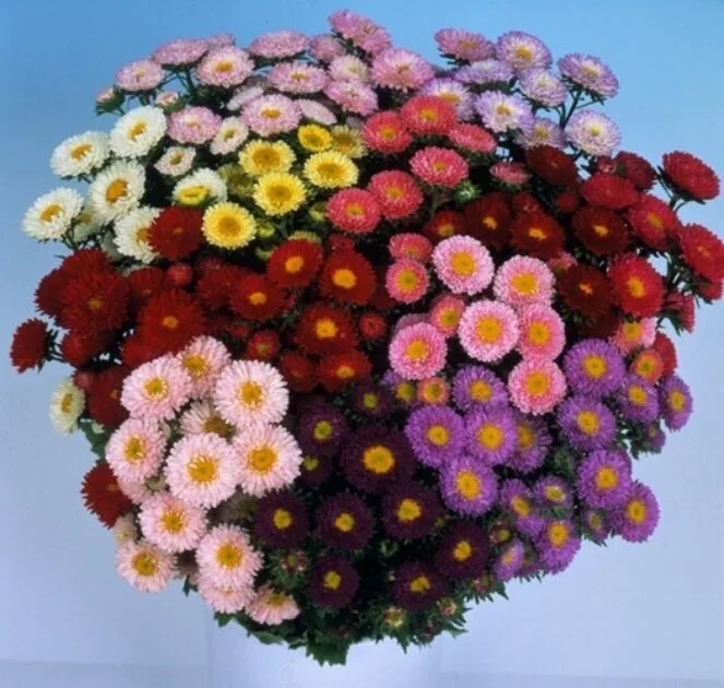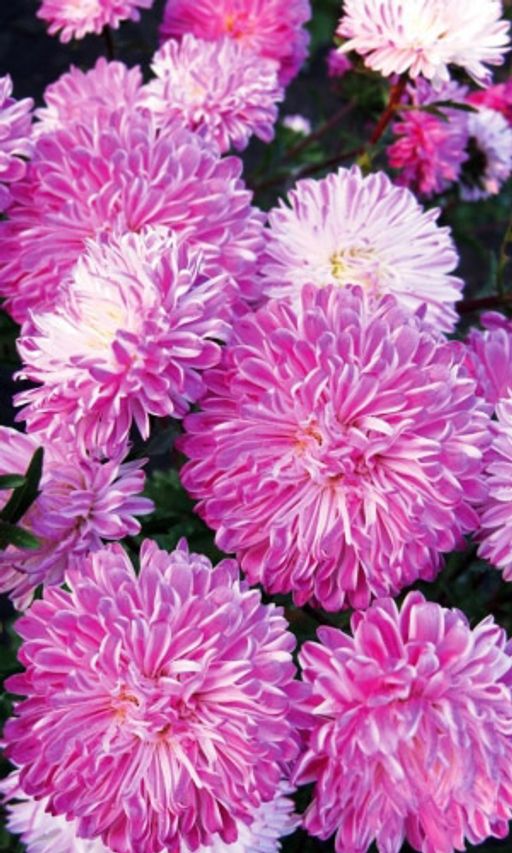 Привлекательная обильно цветущая смесь разных сортотипов астр. Растения высотой до 70см. Цветоносы прочные. Соцветия полусферические или шаровидные, махровые и полумахровые, диаметром до 17см, 10-18 штук на растении. Предпочитают открытые солнечные места. Цветут с августа по сентябрь. Отличаются великолепными срезочными свойствами, до двух недель стоят в воде, сохраняя декоративность. Прекрасно подойдут для оформления цветников и рабаток.